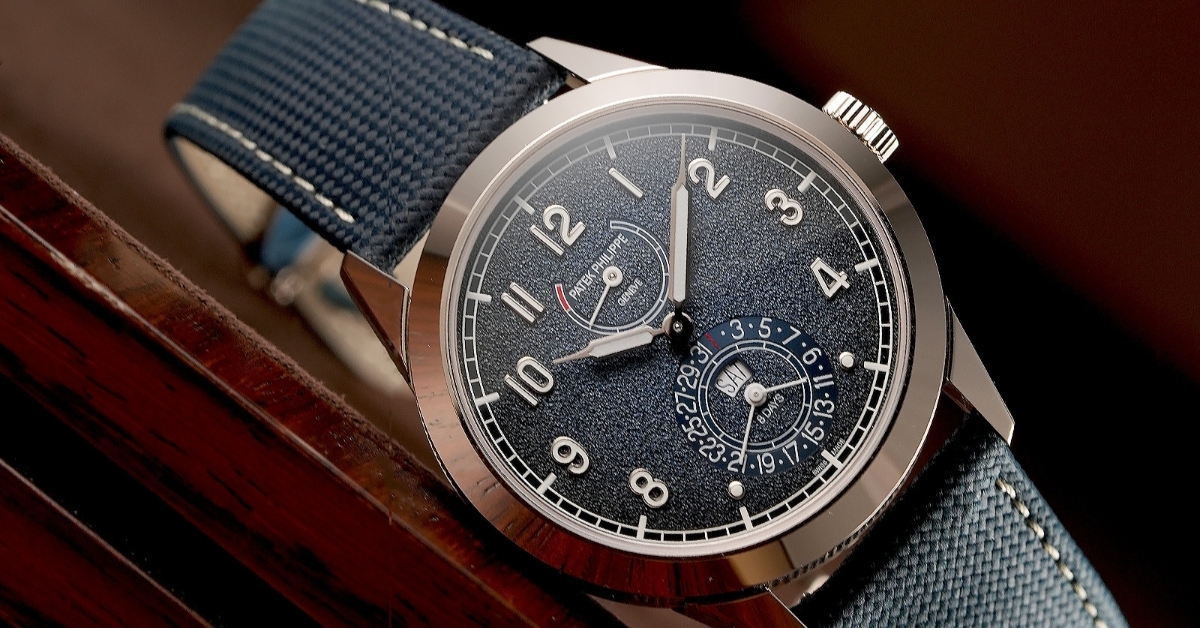 全新Ref. 5328G-001腕錶以18K白金所製,錶徑41mm,在白金圓形錶殼的側面,還可見飾有精細的巴黎飾釘交錯圖案,這種經典飾紋早在1934年就運用在Calatrava系列的時計上。在這樣典雅的錶身之內,是與之形成質感與風格對比的藍色紋理錶盤,盤面上呈現從邊緣的黑至中央深藍的漸變效果,還可見猶如皮革表面般的細緻紋理,帶來不一樣的活力感。