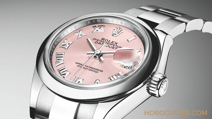面盤配色是相當女性化的粉紅色,搭配羅馬數字時標以及亮面拋光錶圈。粉紅色不僅是女性顧客接受度相當高的顏色,或許還有可能是男性顧客選購女錶進貢太后、貴妃們時最安全牌的顏色?