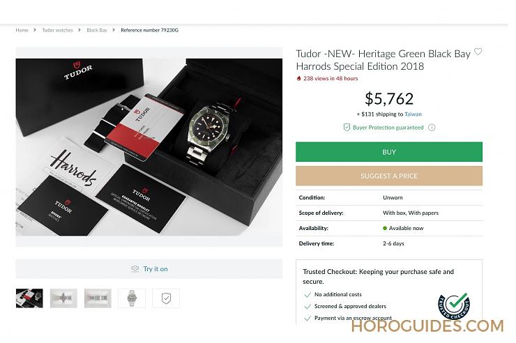 這款Tudor Heritage Black Bay Harrods特別版官方定價是英鎊2,630,但是在chrono24網上你可以看到拍價已達美金5,718,換算成英鎊約是4,400鎊,超過原價的1.5倍。所以超定價不是只出現在勞力士身上,厲害的錶款自然是人人愛,超定價都有人排隊等著買。