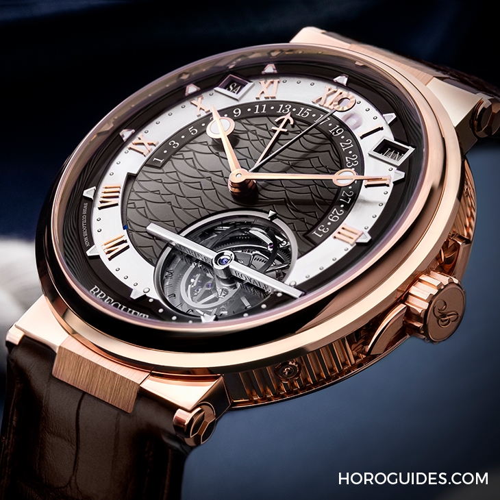 腕錶錶盤中央飾有機刻雕花波浪圖案,象徵Marine航海系列與海洋的聯繫;鑲貼羅馬數字金質時標、寶璣月亮形尖端時分指針、船錨形狀逆跳日期指針,時間等式功能則以鏤空的太陽形狀指針指示。約略4點鐘位置的偏心陀飛輪裝置設有小秒針以及時間等式凸輪,另外10點鐘與2點鐘位置分別設置了星期與月份視窗、7~9點鐘位置為動力儲存顯示。