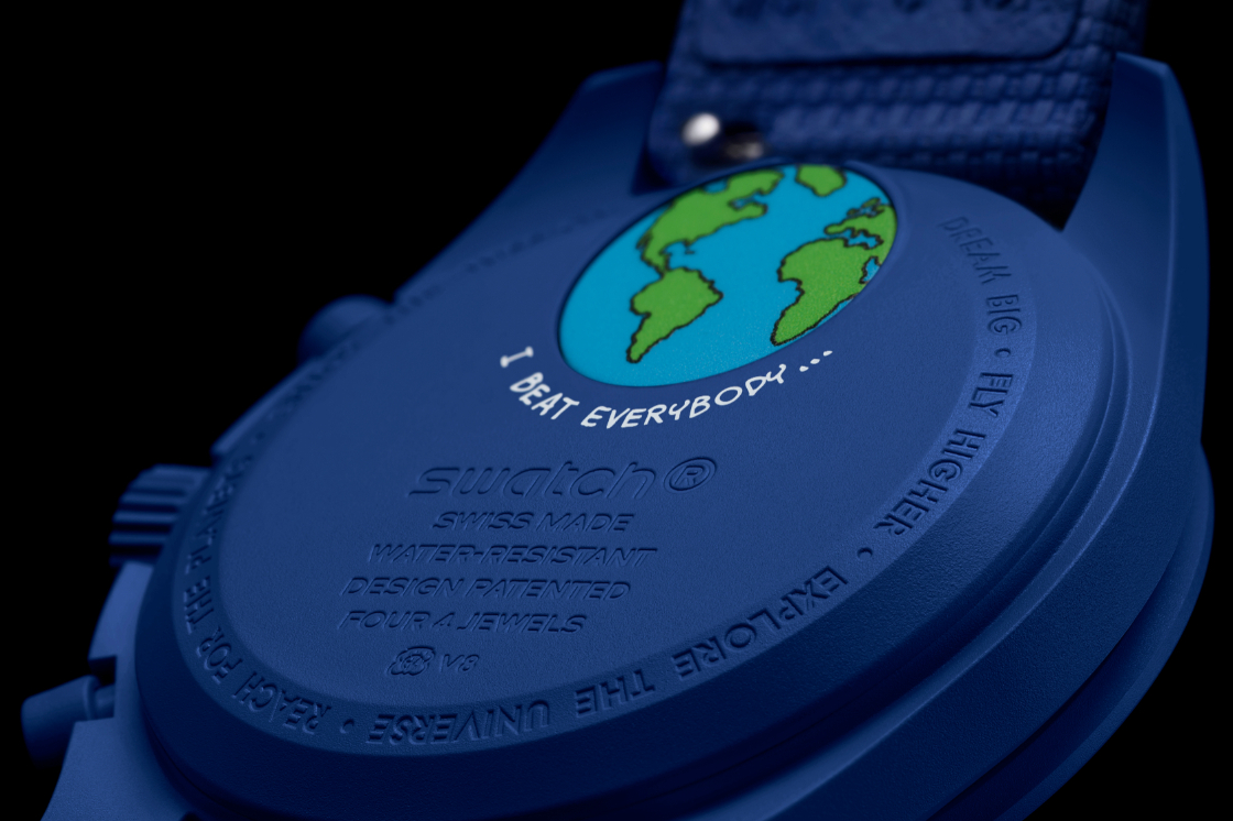 腕錶同樣搭載石英機芯,並在電池蓋上印有地球圖案,下方則是來自Snoopy的登月宣言。腕錶搭配海軍藍色VELCRO®橡膠錶帶,採用海軍藍Bioceramic生物陶瓷錶環,延續太空魅力。