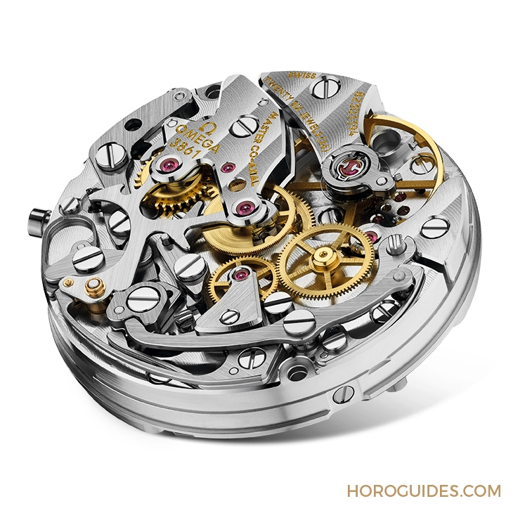 最能表現OMEGA用心的地方則是搭載的3861機芯,這枚機芯可視為經典登月錶機芯861(以及後繼機種1861機芯)的升級版,承襲了相同的機芯尺寸、槓桿式水平離合的計時結構和手動上鍊機制,最重要的升級重點在於換上Co-Axial同軸擒縱,同時升級為Si 14矽遊絲、Nivachoc避震器、15,000高斯抗磁能力與日誤差0/+5秒的大師天文台標準,機能水準與品牌目前線上的幾枚主力機芯齊平。