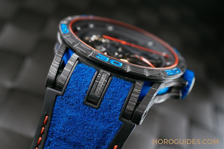 Excalibur Aventador S藍色版本採用與LAMBORGHINI跑車相同的C-SMC碳纖維材質打造錶殼。