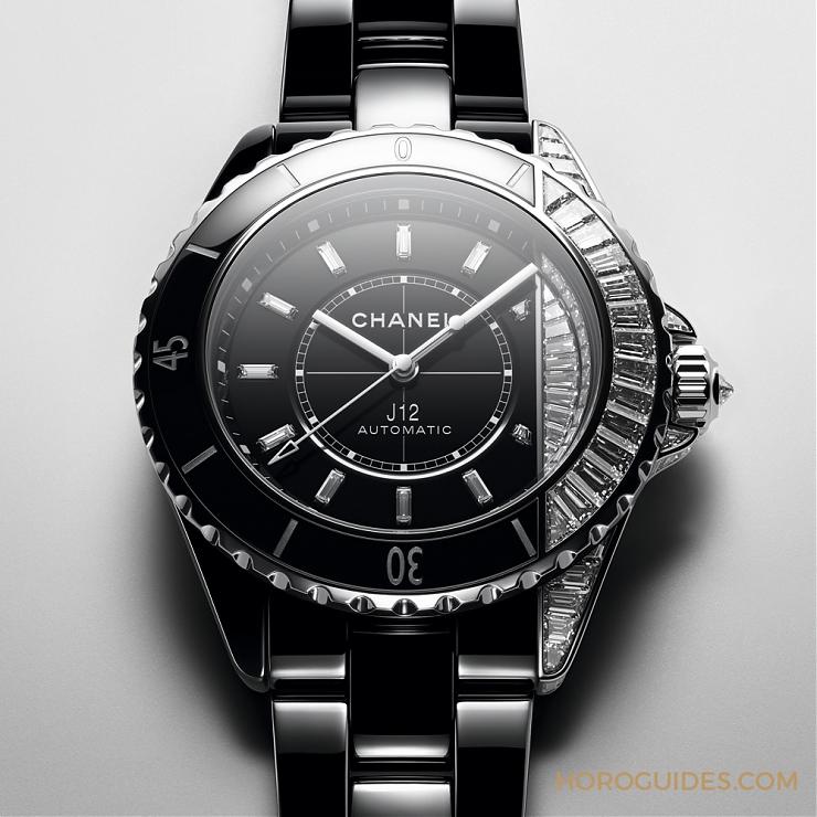 同步亮相的J12 Paradoxe鑽石腕錶,延續了雙色對比的概念,以黑色陶瓷搭配梯鑽鑲嵌。梯鑽鑲嵌的部份包含了錶盤、錶圈、錶殼側邊,一路延伸到錶耳;錶冠上鑲嵌一枚明亮式切割鑽石。透過藍寶石水晶透明底蓋可以欣賞到,Caliber 12.1自動上鍊機械機芯被處理成消光黑的表面質感。