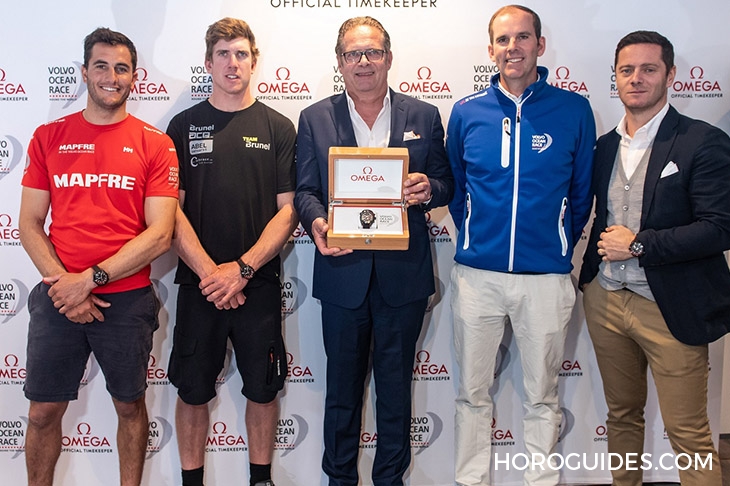 日前歐米茄在美國羅德島新港近岸發表Volvo Ocean Race冠軍專屬腕錶,由左至右依序為紐西蘭帆船金牌選手Blair Tuke, Peter Burling, 歐米茄產品研發副總裁Jean-Claude Monachon, Volvo Ocean Race賽事總裁Richard Brisius, 歐米茄美國地區品牌總裁Arnaud Michon。
