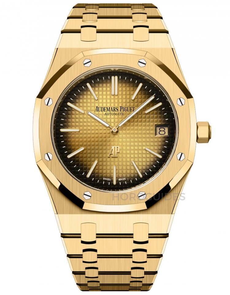 2022 Royal Oak系列50周年,接替熱門型號15202的新一代「Jumbo」16202推出,搭載全新愛彼自製7121自動上鍊超薄機芯,備有不鏽鋼、鉑金、18K玫瑰金與18K黃金四款。搭載的7121機芯是1972年以來Royal Oak「Jumbo」首次搭載全新機芯,接替2121機芯,增加日曆快調功能,裝飾也更為華麗。2022年生產的版本配有50週年紀念特製自動陀,此為無特製自動陀、型號更新後的常態版。四只新款當中此款黃金材質頗受藏家關注,可能是皇家橡樹第一次出現的煙燻金黃色錶盤搭配小型格紋錶面,價位雖然頗高,但勢必能吸引喜愛高度識別性的藏家。