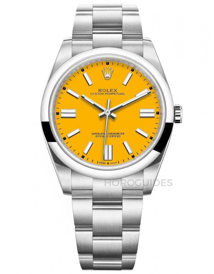 2020年推出的 OP 41mm 系列一口氣推出四種色彩繽紛的漆面質地面盤款式,其中Tiffany Blue可說是詢問度最高的款式,其次為黃色、綠色,並且採用3230機芯,對Oyster Perpetual系列來說是非常大的升級,在價格上也顯得更親民實惠,一推出就獲得市場歡迎。