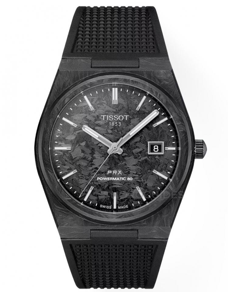 TISSOT天梭表最新推出的PRX 40 Powermatic 80鍛造碳腕錶,以其高性價比幾乎可以稱得上是市場破壞者。這款錶採用40.5mm鍛造碳材質錶殼和錶盤,具備100米防水功能,並搭配可快速拆卸的黑色橡膠錶帶。錶殼和錶盤上獨特的黑灰色大理石紋路,讓整體設計更為搶眼。內部搭載升級版的Powermatic 80自動上鍊機芯,配備矽游絲,大大提升機芯的穩定性和耐用性。