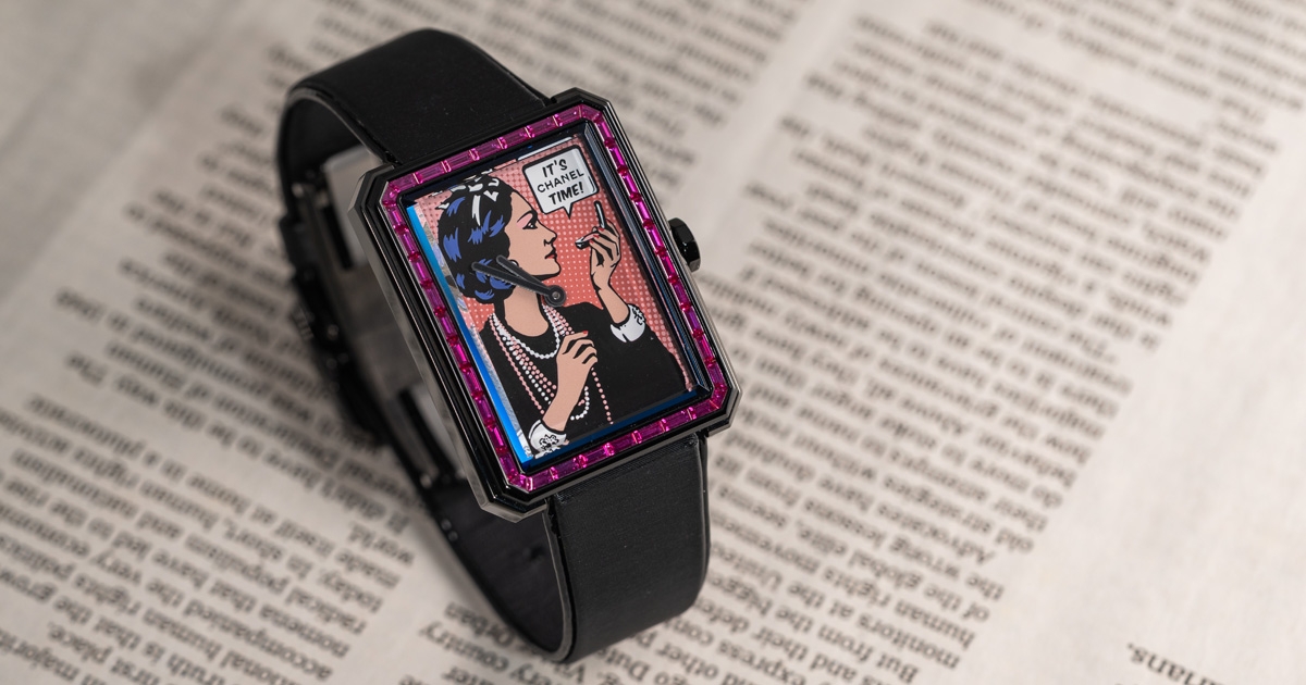 香奈兒女士曾是多位藝術家創作手筆下的主角,以不同風韻的姿態出現在繪畫或攝影作品裡,這一回,透過CHANEL腕錶創意工作室的詮釋,香奈兒女士以普普藝術畫風的模樣躍上BOY∙FRIEND「COCO ART」腕錶。錶盤上的香奈兒女士配戴著她鍾愛的珍珠耳環、長項鍊與寬版手鐲,手持粉盒,望向鏡子。背景裡的粉紅色網點,點出這個畫面與普普藝術的連結,令人驚豔的是,CHANEL以傳統大明琺瑯工藝結合手工轉印技術,詮釋出這禎融合了CHANEL彩妝世界與普普藝術畫風的畫面。
