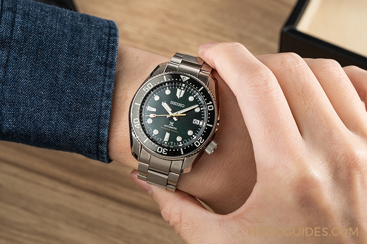 SEIKO Prospex限量紀念款SPB207擁有深邃綠面與金色秒針,鍊帶完整服貼手腕。
