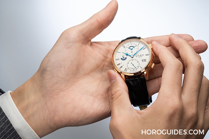 Senator Cosmopolite強大的機能與便捷的操作,所仰賴的正是格拉蘇蒂原創強大的機芯設計功力。儘管複雜精巧的時區功能機械模組隱藏在89-02機芯的3/4夾板下無法讓我們一窺堂奧,但透過透明底蓋還是能夠欣賞到這枚機芯最上乘的修飾工藝,包括藍鋼螺絲與拋光K金寶石套筒、打磨修飾精美的3/4夾板,還有以手工雕刻裝飾的雙鵝頸微調等工藝細節,感受德國製錶工藝精髓的魅力。