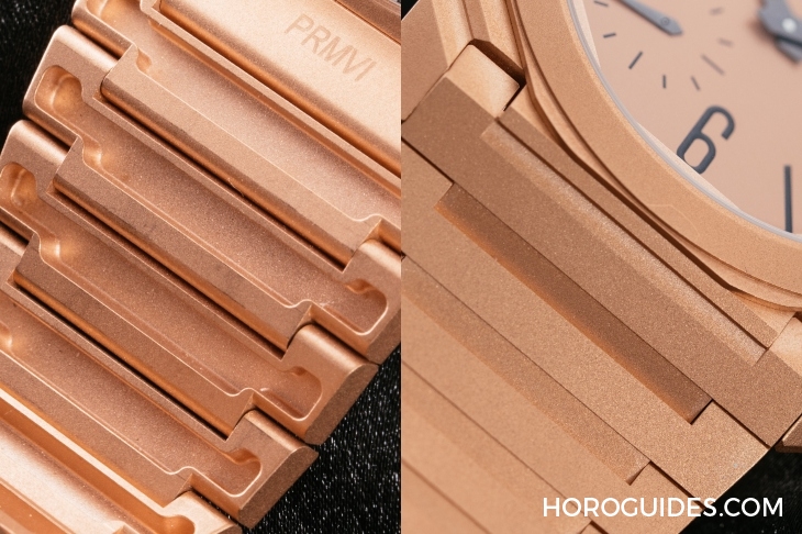 圖左為磨砂玫瑰金鍊帶背面,並非做實心,這樣配戴起來才不會太沉,圖右則可看出緞面打磨的細緻。