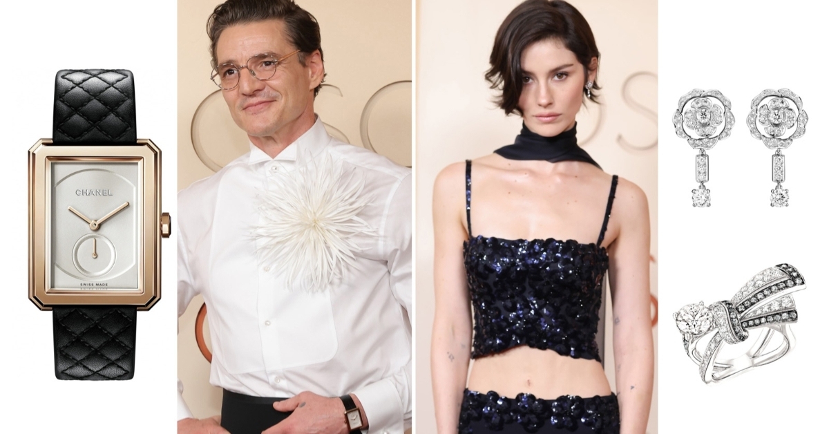 近期炙手可熱的好萊塢爹系男神Pedro Pascal,選擇以一副CHANEL金框眼鏡、一只CHANEL Boy∙Friend腕錶搭配黑白色調的正式禮服。這只小三針腕錶是CHANEL旗下錶徑較大的常態性款式,直徑37 x 28.6mm的錶殼採18K BEIGE米色金打造,圓形小秒盤位於白色面盤的6時位置,與飾以一朵毬狀白色羽毛胸花的白色府綢襯衫巧妙呼應。
