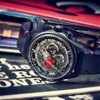 黑色小牛皮錶帶裝飾搖滾風格熱壓印圖案和紅色縫線,搭配黑色PVD塗層鈦金屬三摺疊式錶扣,更加展現渾然天成的搖滾風格。全球限量250枚,每一枚腕錶均隨附特別錶盒。