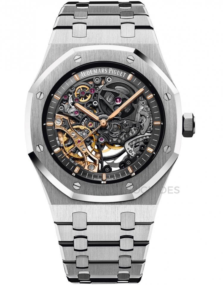 結合了優異的雙擺輪技術、精湛的鏤空工藝,以及Royal Oak 的經典設計元素,這款Royal Oak 雙擺輪腕錶在2016 年一推出就受到相當熱烈的迴響。不同於先前的Millenary 系列或是2010 年的愛彼擒縱所採用的反向雙遊絲提高等時性的設計,這個以3120 機芯為基礎升級的雙擺輪技術,採用了兩組同軸反向配置的獨立擒縱系統,隨時補償擒縱系統因重力影響產生的方位差,透過差速器協調出精準頻率,可以說是替代陀飛輪的經濟方案。而雖然雙擒縱的設計會造成比較大的動力消耗,不過3132 機芯的動力儲存還是維持在45 小時的水準,雖然低於3120機芯的60 小時但仍堪日常使用。與雙擺輪受到相同矚目的,還有這枚腕錶的鏤空工藝,愛彼運用極為精湛的鏤空工藝在這只腕錶上,不僅雕鏤極為通透,更以手工仔細地做
