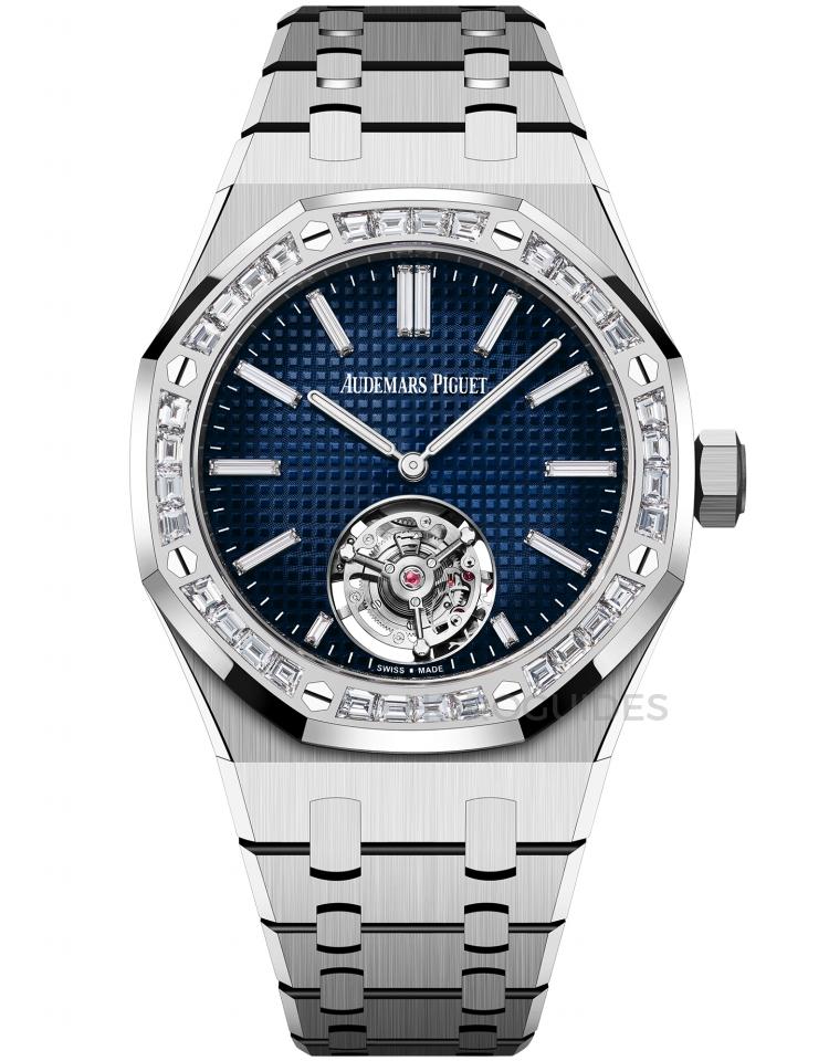 這款37毫米的Royal Oak採用白金錶殼與煙熏藍色Petite Tapisserie錶盤,搭載纖薄的Calibre 2968自動上鏈機芯,厚度僅8.1毫米,飛行陀飛輪設計在技術與美學上達到新的高度。該款腕錶鑲嵌12顆長方形切割鑽石,展現出低調奢華感。儘管限量且價格高昂,但其精緻的設計與技術深受藏家推崇。部分人認為其鑽石錶圈略顯華麗,適合喜愛奢華風格的藏家,而另一些人則更期待無鑽款的推出。