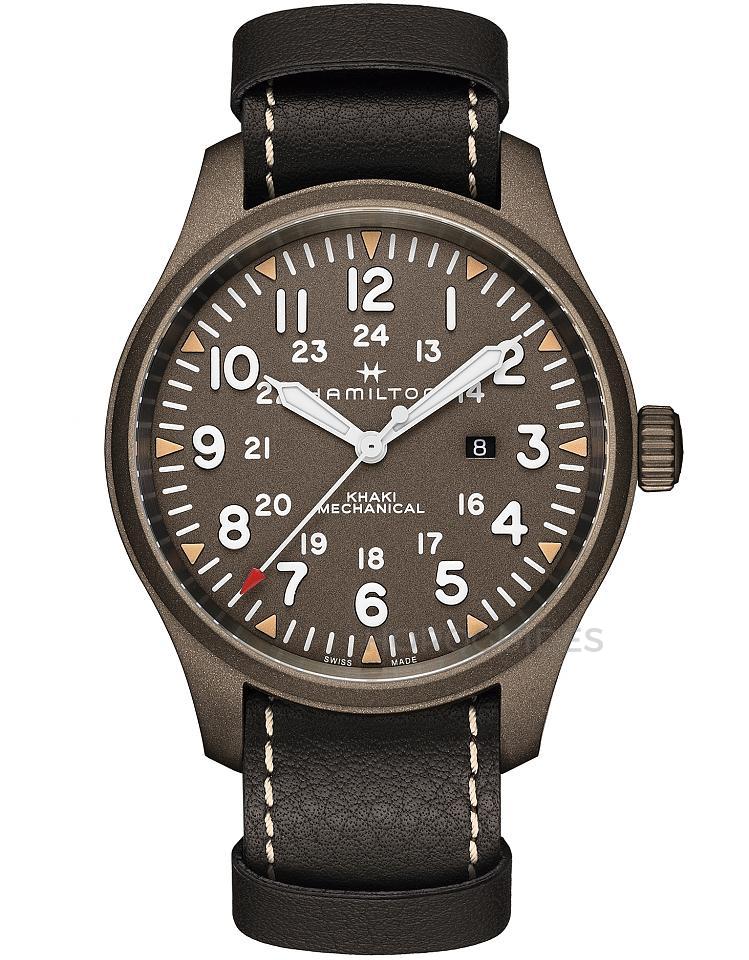 漢米爾頓以二戰時期美國陸軍准將級軍官打造的專屬錶款為原型,錶款整體都以「槍鋼色啞光」處理,錶殼使用超大50毫米錶徑,阿拉伯數字時標都十分立體,其由Super-LumiNova®夜光塗層打造,每個時標1mm高,搭載獨家專屬全新H-50機芯,擁有80小時的手上鍊動力儲存功能。
