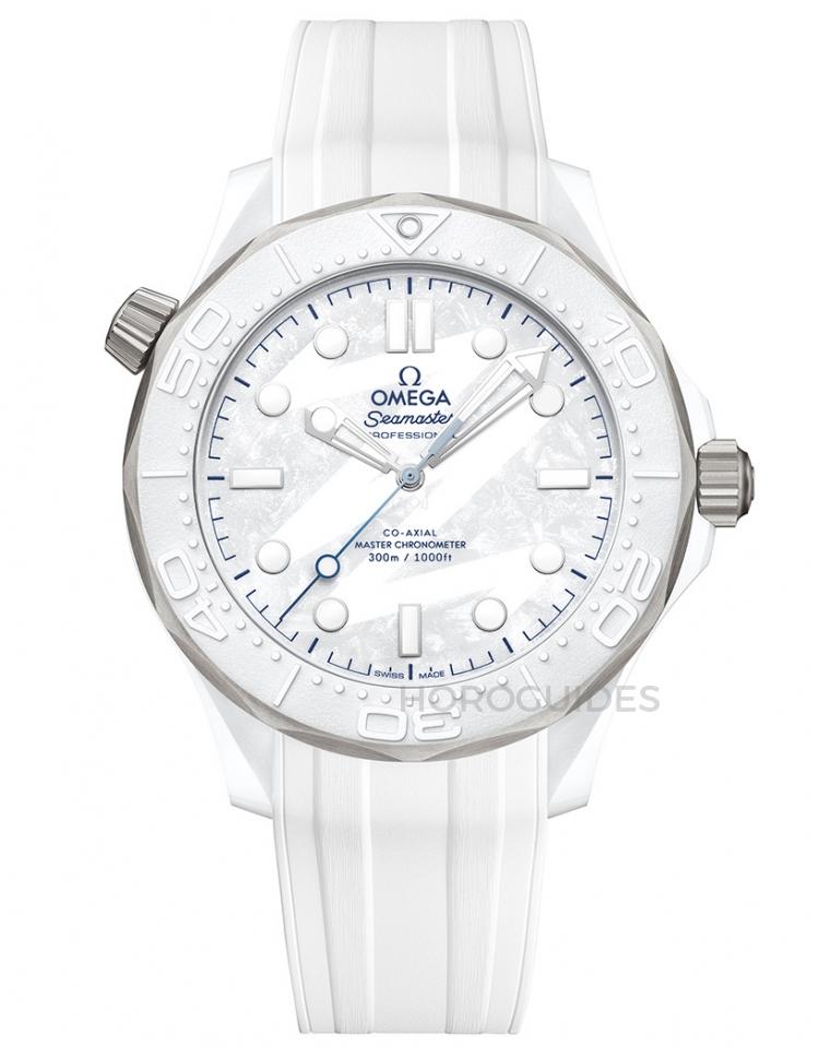 OMEGA為即將到來的米蘭科爾蒂納2026年冬奧發表全新Seamaster Diver 300M,43.5mm白色陶瓷錶殼,局部部件採用5級鈦金屬,白色陶瓷錶盤綴以雷射鐫刻冰霜質感飾面,並延伸出一道指尖劃過的冰痕紋理,靈感源自米蘭科爾蒂納2026年冬奧標誌中的數字「26」,5級鈦金屬底蓋同樣刻有冬奧標誌。採用白色陶瓷材質的錶圈以雷射蝕刻出浮雕刻度,亮漆中央計時秒針呈現藍色漸層效果,鍍銠指針和時標則覆以白色Super-LumiNova超螢光塗層,搭配白色橡膠錶帶與鈦金屬錶扣。錶款的全白配色致敬與第25屆冬奧的聯繫,同時也是OMEGA少數白色陶瓷錶款,為Seamaster 系列提供與眾不同的選擇。