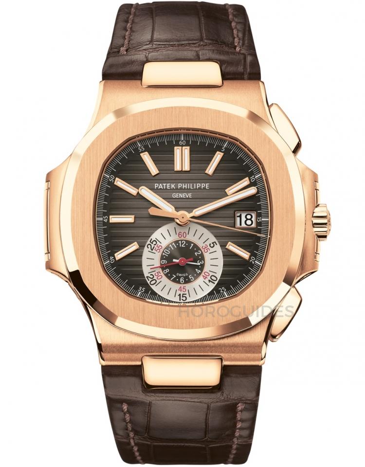 5980R為PP當家Nautilus計時款式,此款採用鱷魚皮製錶帶配搭貴金屬錶身,展現Nautilus奢華休閒風格。錶款採用5N 18K玫瑰金,同時立體金質柱狀時標、時針和分針,亦採用玫瑰金製造。錶款採用咖啡漸變黑色面盤,並綴以橫向坑紋圖案。腕錶六時位置為計時盤,附設兩枚指針和三個同軸刻度,當腕錶計時時,可分別顯示小時和分鐘。錶款採用CH 28-520 C自動上鍊導柱輪機芯,配備飛返和日期顯示功能。