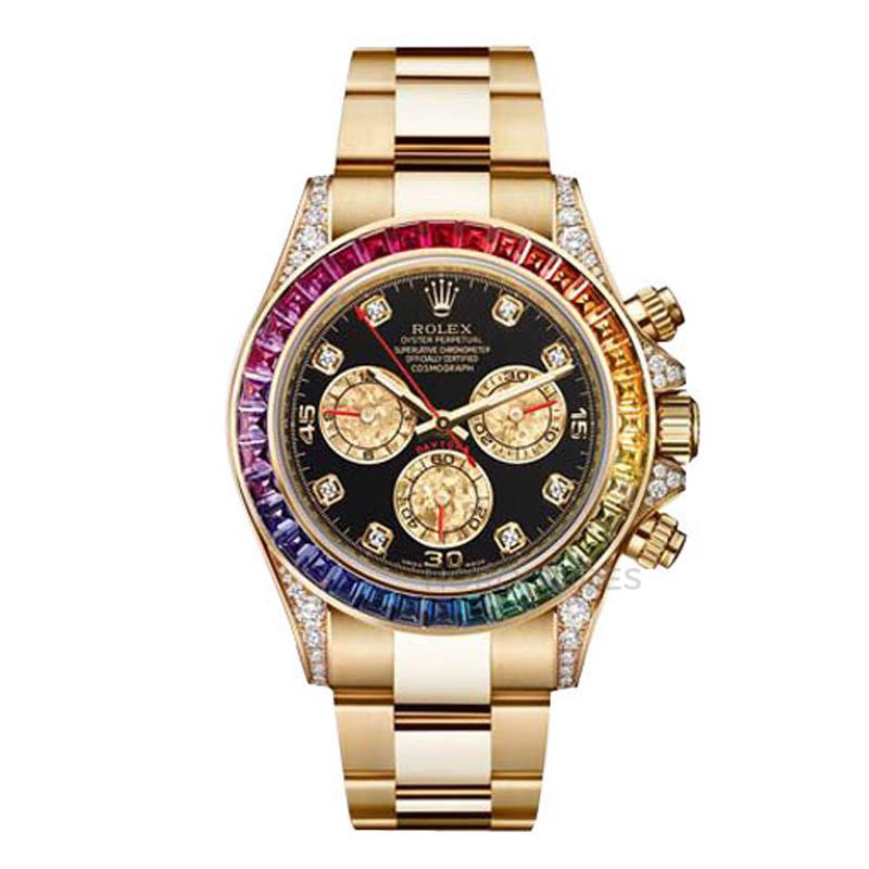Daytona迪通拿是勞力士唯一有計時功能的系列,加上貴金屬材質或是鑲鑽更是身價不凡。這款「彩虹圈」在錶圈鑲上紅橙黃綠青藍紫共七種顏色36顆的彩鑽,計時盤為特殊的金晶材質,雖然價格不菲,但追貨者眾,又因錶徑40釐米並不過份誇張,因此受到不少貴婦名媛喜愛。