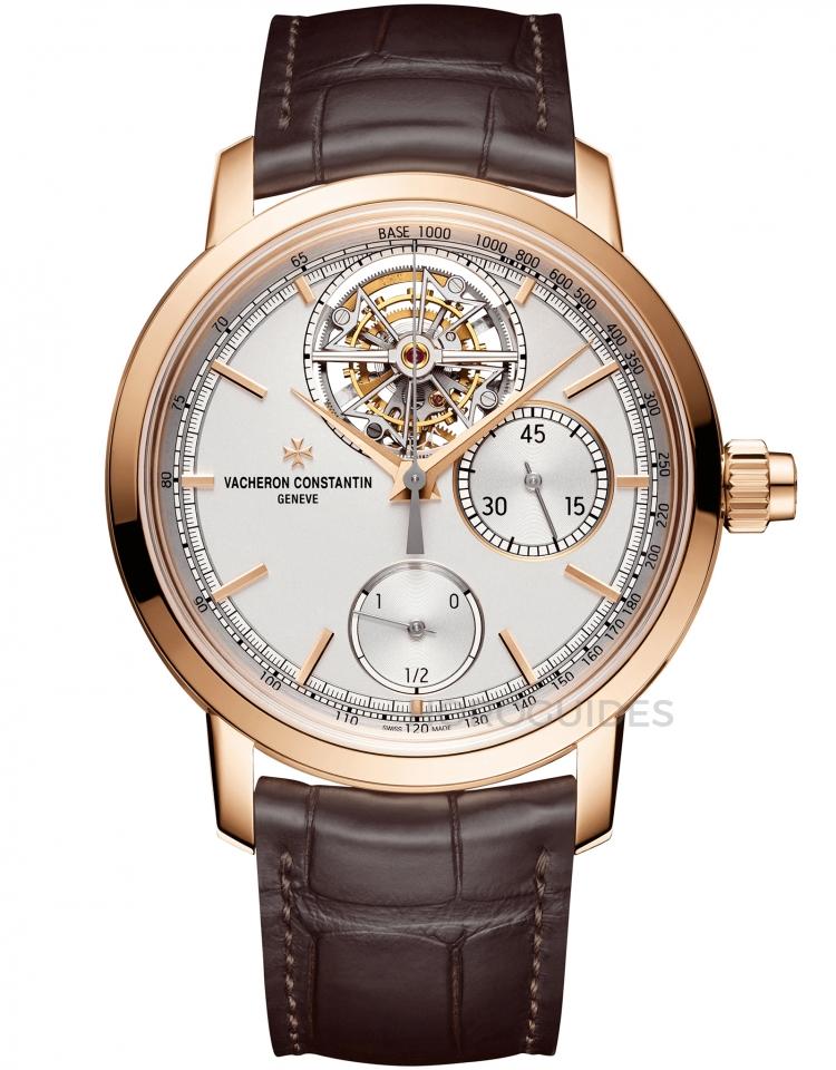江詩丹頓這款Traditionnelle陀飛輪計時碼錶12點鐘陀飛輪裝置有著馬爾他十字形狀的框架,品牌識別度滿點,3點鐘是45分鐘計時積分盤、6點鐘為動力儲存顯示。此外少見的單按把計時,在現代外型下,操作帶有復古懷舊感,是屬於資深行家能領略的樂趣。錶款搭載江詩丹頓3200自製手上鍊機芯,震頻18,000vph,通過日內瓦印記認證;而VC錶背的機芯風光從來不讓人失望,夾板優美的分件形狀、倒角修飾與日內瓦波紋裝飾、水平離合裝置、馬爾他十字導柱輪,無論複雜度、工藝性都有看點。