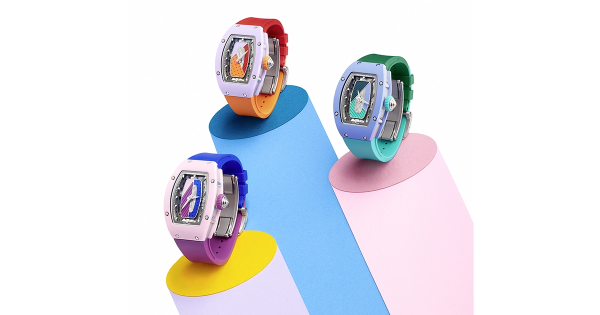 RM 07-01三款彩色陶瓷腕錶皆配備不同顏色錶殼及錶盤圖形元素,其繽紛色彩為夏日帶來無盡雅趣,搭載品牌自製CRMA2自動機芯,具有50小時動力儲存。中央錶盤由陶瓷、飾有幾何圖案的橡膠、以及RICHARD MILLE首次採用的手工璣鏤雕花拼接而成。