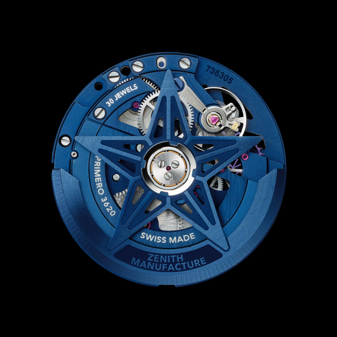 白色陶瓷錶殼擁有交替的緞面打磨與拋光表面,搭配標誌性的十二邊形錶圈,防水深度達100米。藍色鏤空錶盤隨光線變化顯現不同的藍色調,並採用了ZENITH從1969年起使用的著名四芒星設計。錶盤6點鐘位置設有全球首創且唯一的恆定速度1/10秒顯示,每10秒旋轉一圈。