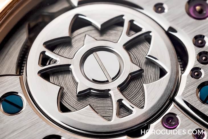 例如發條盒上鏤空裝飾的桔梗花樣,是微型藝術工坊所在地鹽尻市的市花,同時也是工坊的標誌,在機芯的4點鐘位置同樣可以看到淺淺的部門Logo雕刻。在桔梗花樣的設計上,Eichi II特地做出非常多的轉角,包括往外尖起的「出角」,以及往內凹落的「入角」,由於是在零件的內側,且角度刁鑽,代表只能以手工逐一打磨。