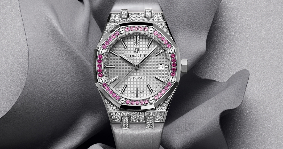Audemars Piguet愛彼皇家橡樹15452系列,是結合貴金屬與寶石的精緻奢華之作,在錶徑37mm、搭載愛彼自製3120自動上鍊機芯的規格條件下,以細膩手筆揮灑得自天然寶石千變萬化的絕妙色彩。此系列最新亮相的兩款新作,分別以白金與玫瑰金打造,錶圈鑲嵌鑽石與多種寶石,扭索紋錶盤以藍色或米色呈現,營造出灰玫瑰粉紅色調與米橙色調這兩種精緻又饒富女人味的色彩組合。