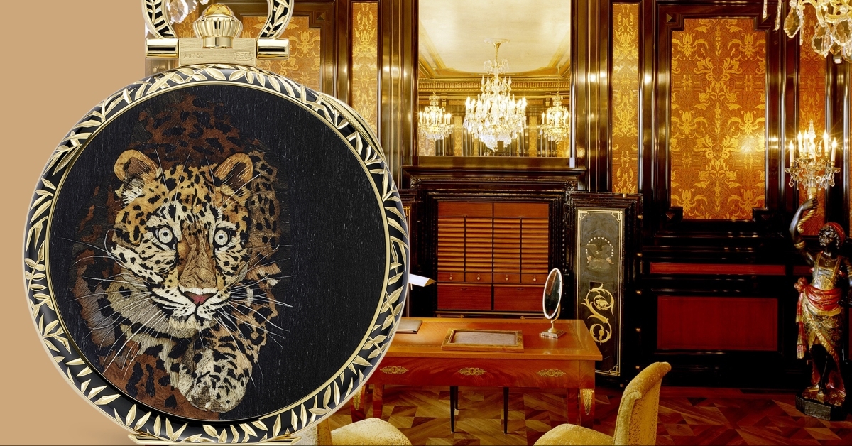 Ref. 995/137J-001「豹」(Leopard)懷錶,展示微型木鑲嵌、人手精雕和內填琺瑯裝飾工藝,搭載17''' LEP PS手動上鍊機芯。