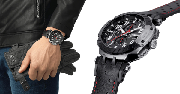MotoGP 2020年T-Race自動腕錶限量版錶殼採用不鏽鋼與黑色玻璃纖維疊加構造,錶圈和錶冠護肩設計參考了剎車盤和卡鉗,錶盤亦參考了電單車的速度錶和轉速錶。