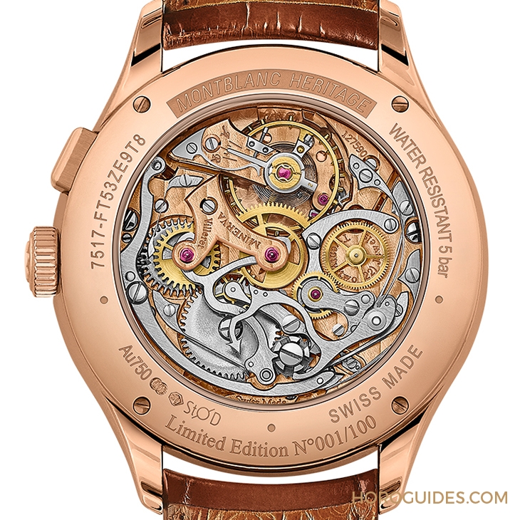 從錶背的藍寶石水晶玻璃可以見到萬寶龍自製單按把計時碼錶機芯MB M13.21的高水準手工修飾。這款高級機芯的大型擺輪具備18顆螺絲,振頻為傳統的18,000次/小時,配備導柱輪和水平離合,標誌性的V形計時橋架為1912年專利設計,並設有經典手工裝飾Minerva箭頭。MB M13.21機芯配備鍍玫瑰金夾板和夾板橋,與18K玫瑰金錶殼和煙棕色錶盤互相輝映。