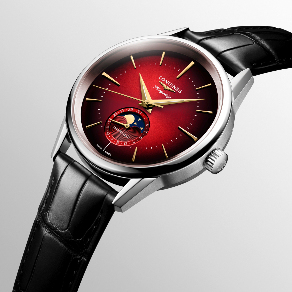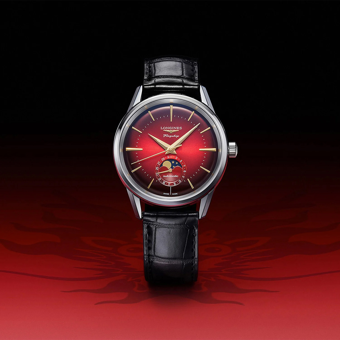 LONGINES浪琴表推出Flagship Heritage旗艦系列復刻月相腕錶龍年生肖特別版,這也是浪琴表第一款生肖特別腕錶。不鏽鋼材質錶殼、錶徑38.5mm,飽滿豔麗的漸層紅色面盤搭配金色的指針與時標,配色格外尊榮喜氣。這次浪琴與中國藝術家林子楠攜手合作,為迎接2024年龍年特別創作了一款獨特的龍型圖案,龍年的重點元素則出現在錶背鐫刻的龍首圖騰,龍頭的鬍鬚與毛鬃隨風舞動,格外威武。錶款搭載L899.5自動上鍊機芯,防水30米,限量非常吉利的888只。