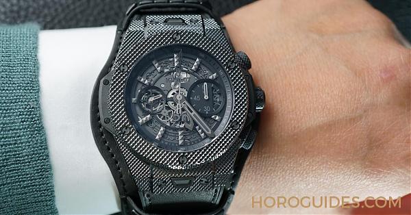 錶款採用黑色陶瓷錶殼與錶圈,面盤做了大幅度的鏤空,極高的透視度讓全黑的錶款也能有所層次,而這本來就是宇舶相當擅長的色彩與設計。這款最特別的(基本上你也不可能沒注意到)就是從錶殼、錶圈到錶冠與計時按把,都裝飾了滿滿的卯釘,看起來好像有點扎人,不過尖端都做了圓角的修飾,所以不會真的變成移動的腕上兇器。