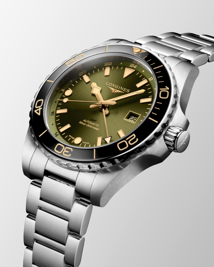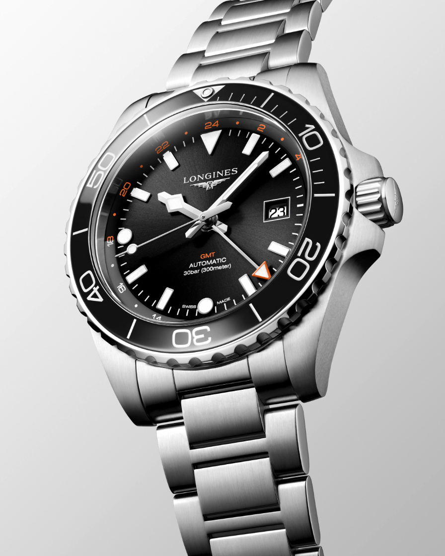 針對Hydroconquest GMT系列新一代GMT功能錶款,錶內搭載配備矽游絲與非磁性創新材質零件的全新L844.5自動上鍊機芯 ,抗磁能力為ISO 764標準的十倍以上,動力儲存亦長達72小時。腕錶搭載全新設計的H形鍊節不鏽鋼錶鍊,同時配備微調摺疊扣,實屬首見。另提供對應錶盤顏色的藍色及黑色橡膠錶帶,打造多元造型。