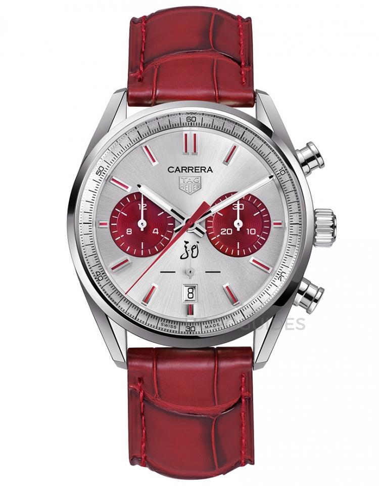 Carrera Chronograph推出兩款龍年限量版,此款為銀色太陽光線雕紋錶盤與鍍銠時標,點綴紅色塗漆與紅色計時盤,錶盤6點位置還以書法演繹一個「龍」字,底蓋上沿邊裝飾的中華龍圖案,搭配紅色鱷魚皮錶帶,另有採鍍18K 5N玫瑰金錶盤與時標的玫瑰金款式。