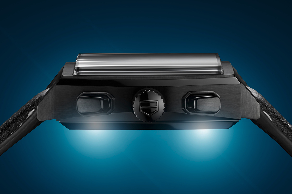 錶徑39mm的經典尺寸,復古的經典輪廓,黑色DLC 5級鈦金屬錶殼,方中帶圓的錶盤,錶盤內大舉施以夜光塗層,包含夜光刻度環、小錶盤、中央指針與錶盤外圍,充分展現「Night Driver」的意境。Super-LumiNova®夜光塗層的亮光,與其他部分形成強烈對比,在黑暗中清晰可讀,夜光效果可維持三小時。