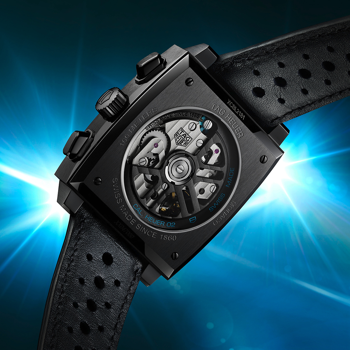 搭載Heuer 02自動機芯,具有導柱輪和垂直離合器,動力儲存80小時。透過透明錶背可以欣賞到黑色自動盤標註藍色印刷字樣的黑色自動盤,以及藍色導柱輪。