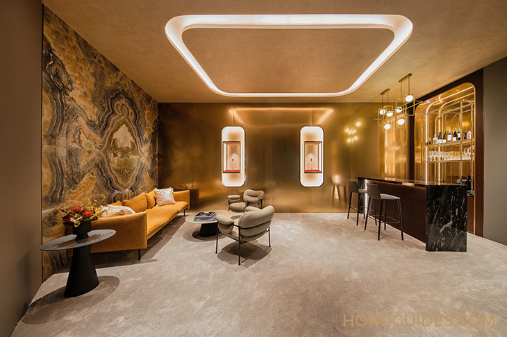 一般複合錶店多會以分區形象櫃呈現各別品牌特色,但SHH選擇以更積極的姿態打造屬於自己的零售品牌。店內裝潢大量採用溫暖金屬銅色、投射鏡面、奢華大理石紋,點綴亮眼火紅背板展示櫃,華麗的強烈視覺統整所有品牌,透過寬敞大器空間,提供藏家盡情探索製錶工藝的奢華體驗。