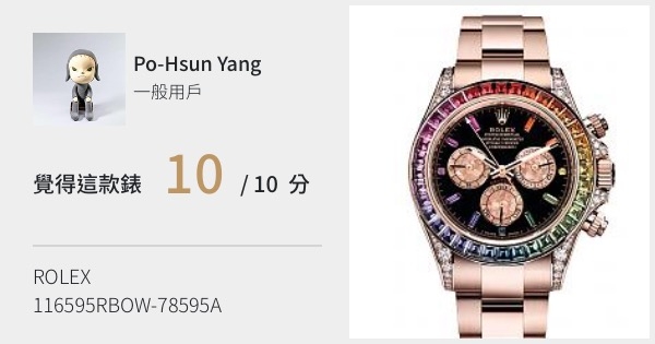 Daytona迪通拿是勞力士唯一有計時功能的系列,加上貴金屬材質或是鑲鑽更是身價不凡。這款「Rainbow彩虹圈」在錶圈鑲上紅橙黃綠青藍紫共七種顏色36顆的彩鑽,計時盤為特殊的玫瑰金晶材質。鑑於前一代黃金材質的116598RBOW大受歡迎,拍賣行情甚至還飆出近三倍高價,此次改版玫瑰金,市場反應也是非常轟動。
